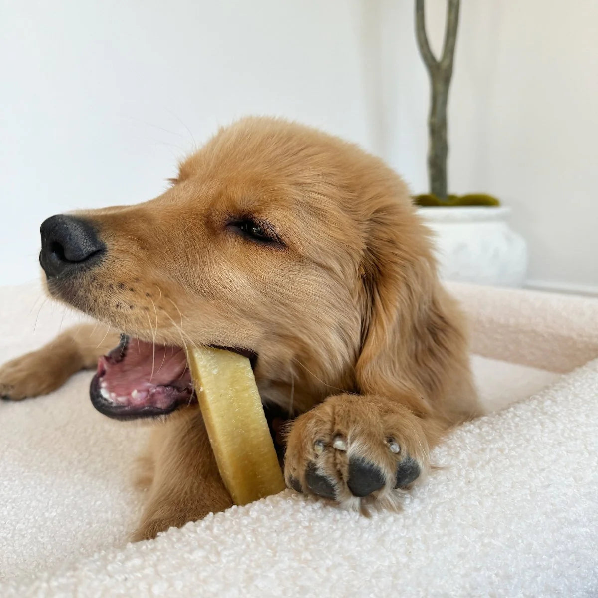 If your dog is new to natural chews or typically enjoys softer treats, you may soak the chew in water for about 10 minutes before serving. This gently softens the texture, making it easier on sensitive teeth.